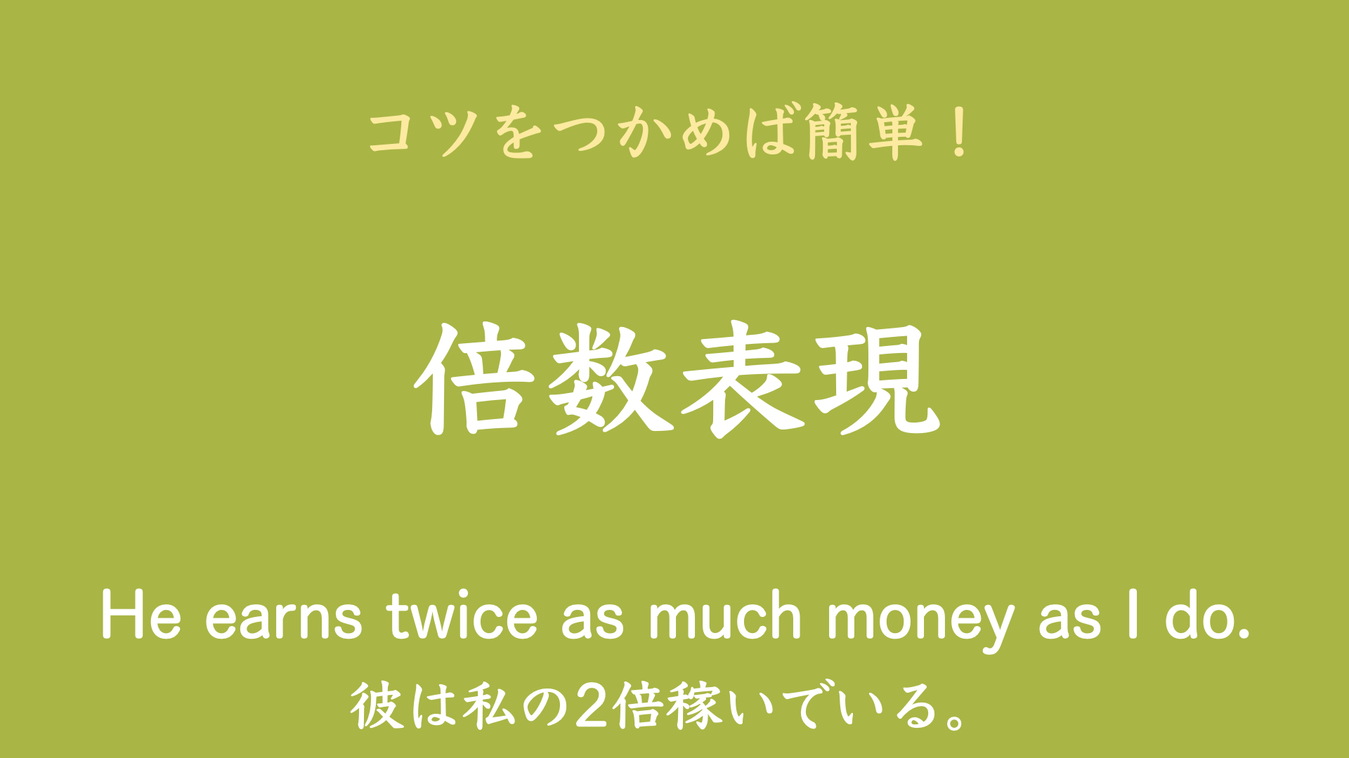 この映像授業では「【高校 英語】 倍数の表し方」が約5分で学べます。身につけたいポイントは「twice as … as ~ 「~の2倍・・・だ」 など」です。映像授業は、【ポイントのおさらい】⇒【練習】⇒【入試レベルにチャレンジ】⇒【今回のまとめ】の順に見てください。