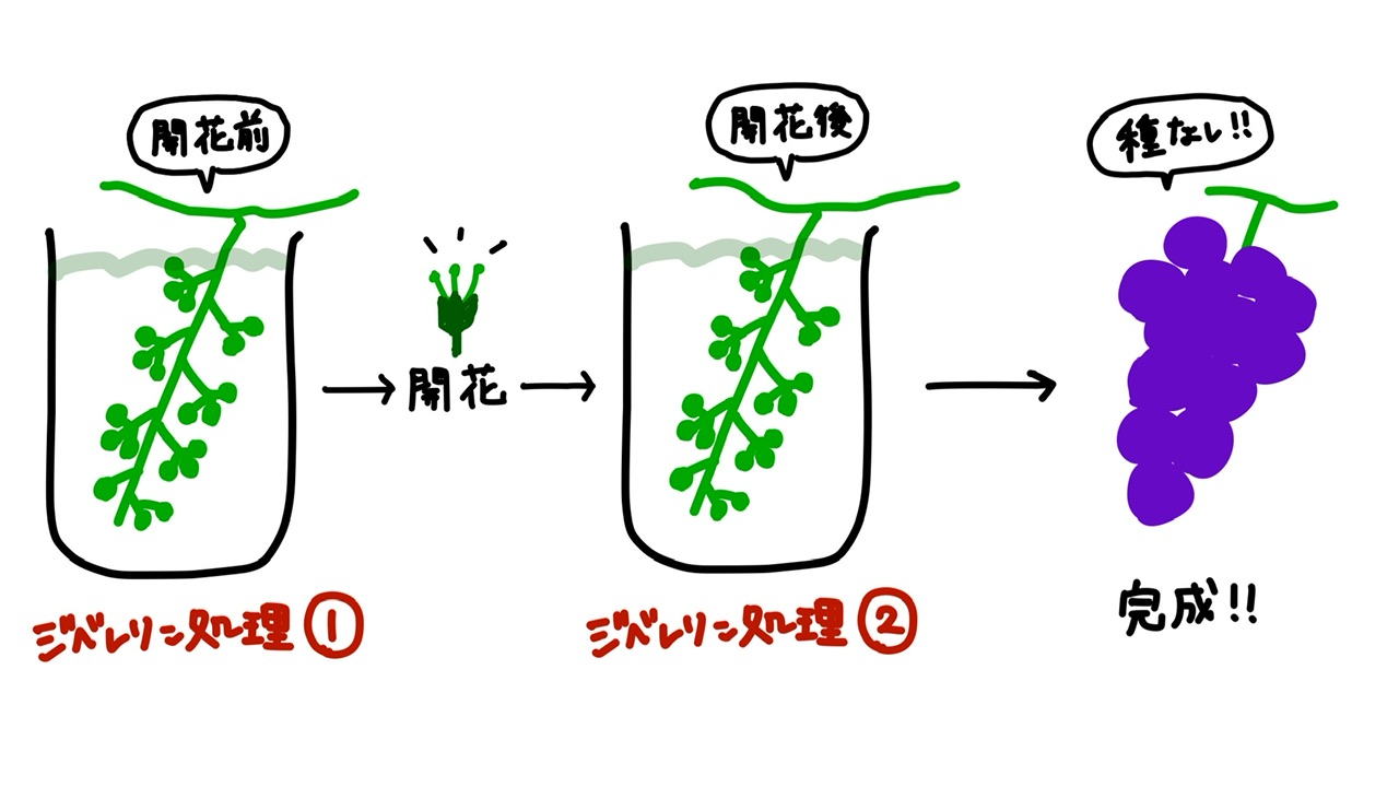このジベレリンのはたらきは,種なしぶどうの産生などにも応用されている。
