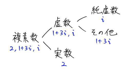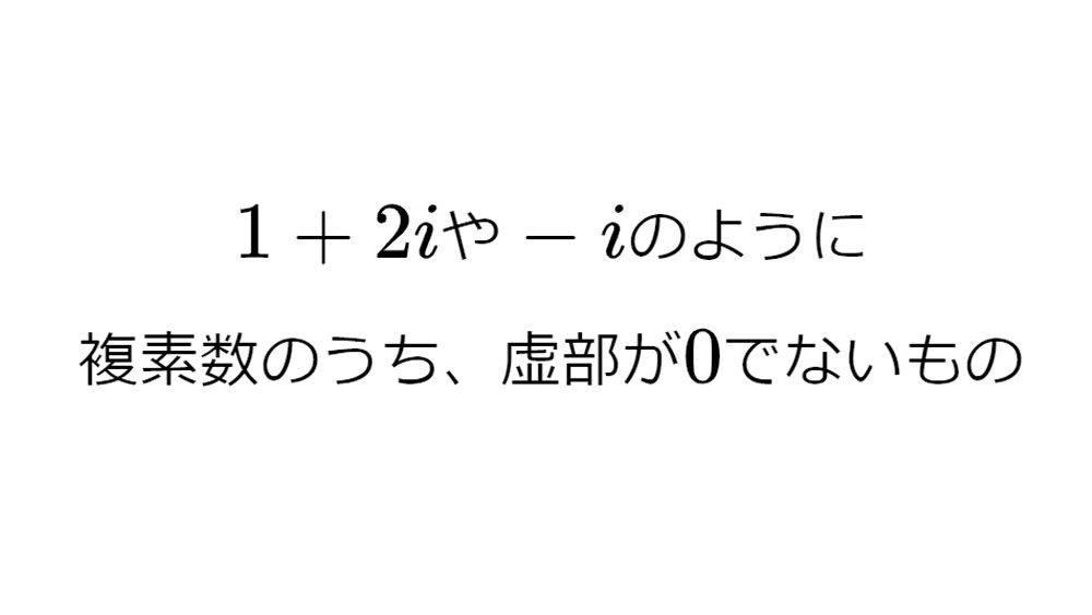 ちなみに、 虚数と複素数がよくこんがらがるので注意。複素数は何でもありな数で、 実数も複素数の一部。虚数は、複素数 ( は実数)のうち実数でないもの、つまり のものをいう。