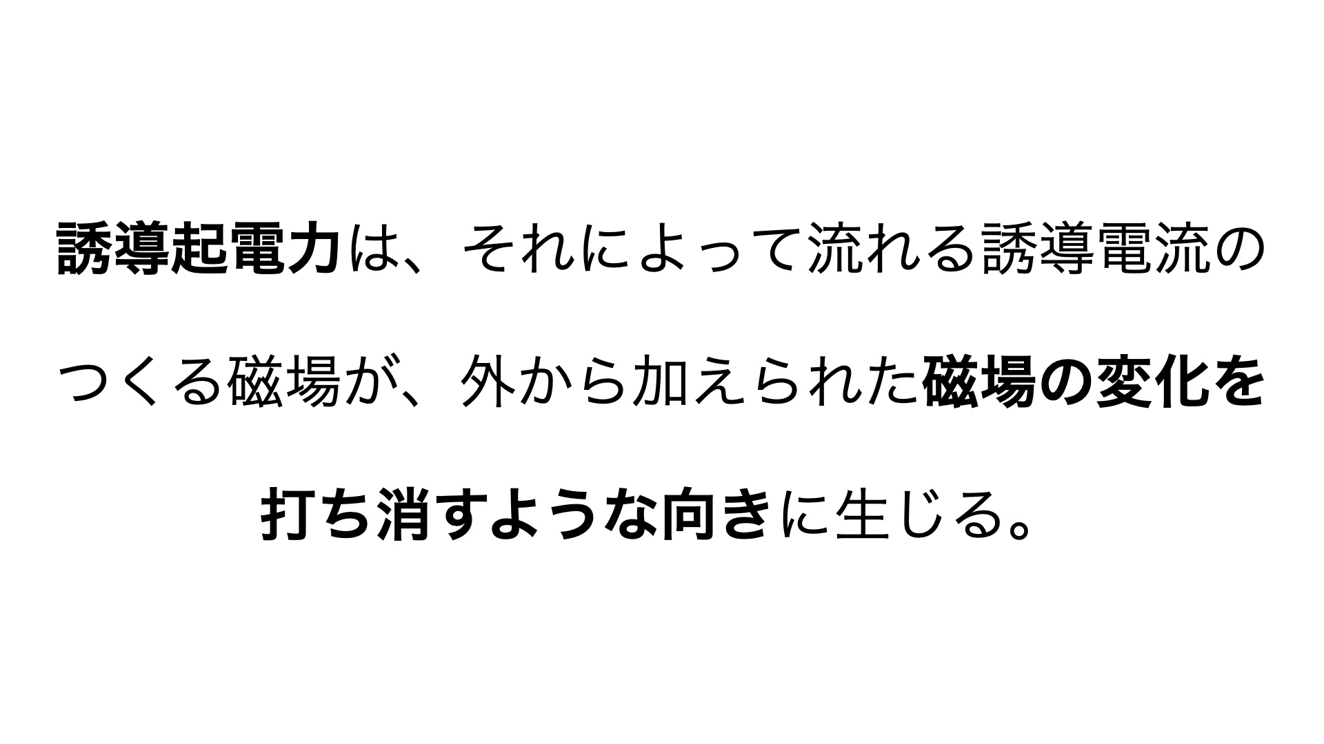 とわかる。ちなみに、磁場の変化を打ち消し合うような誘導電流を流す向きに、誘導起電力が生じる。