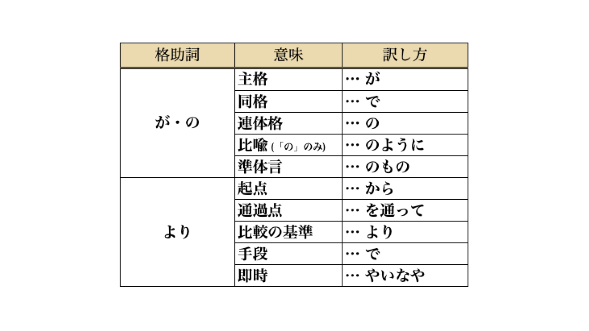 古文の助詞については、テスト前にテキストの裏表紙の裏の表を暗記する方も多いと思うが、「本は重いので学校に置いてきた」「スマホで調べたい」というときはこれでサクッと確認できる。