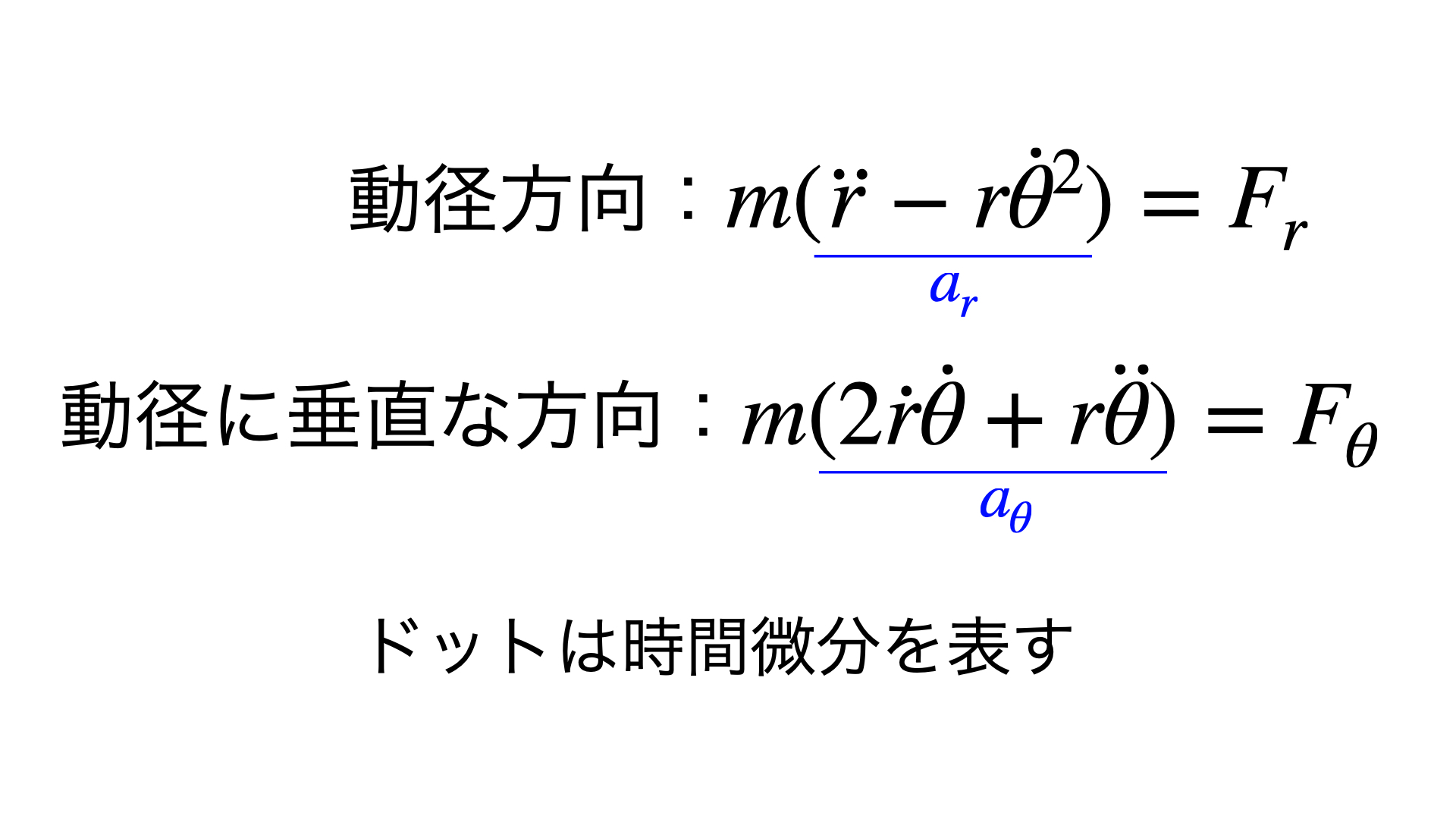 で表される。等速円運動ではこの式を立てられなければジ・エンドな問題も多いので、必ず頭に入れておこう。また、等速でないような円運動(例えばジェットコースターみたいなの)でも、半径がもし一定であれば、中心方向の運動方程式は上記の式で考えられる。(この場合は、