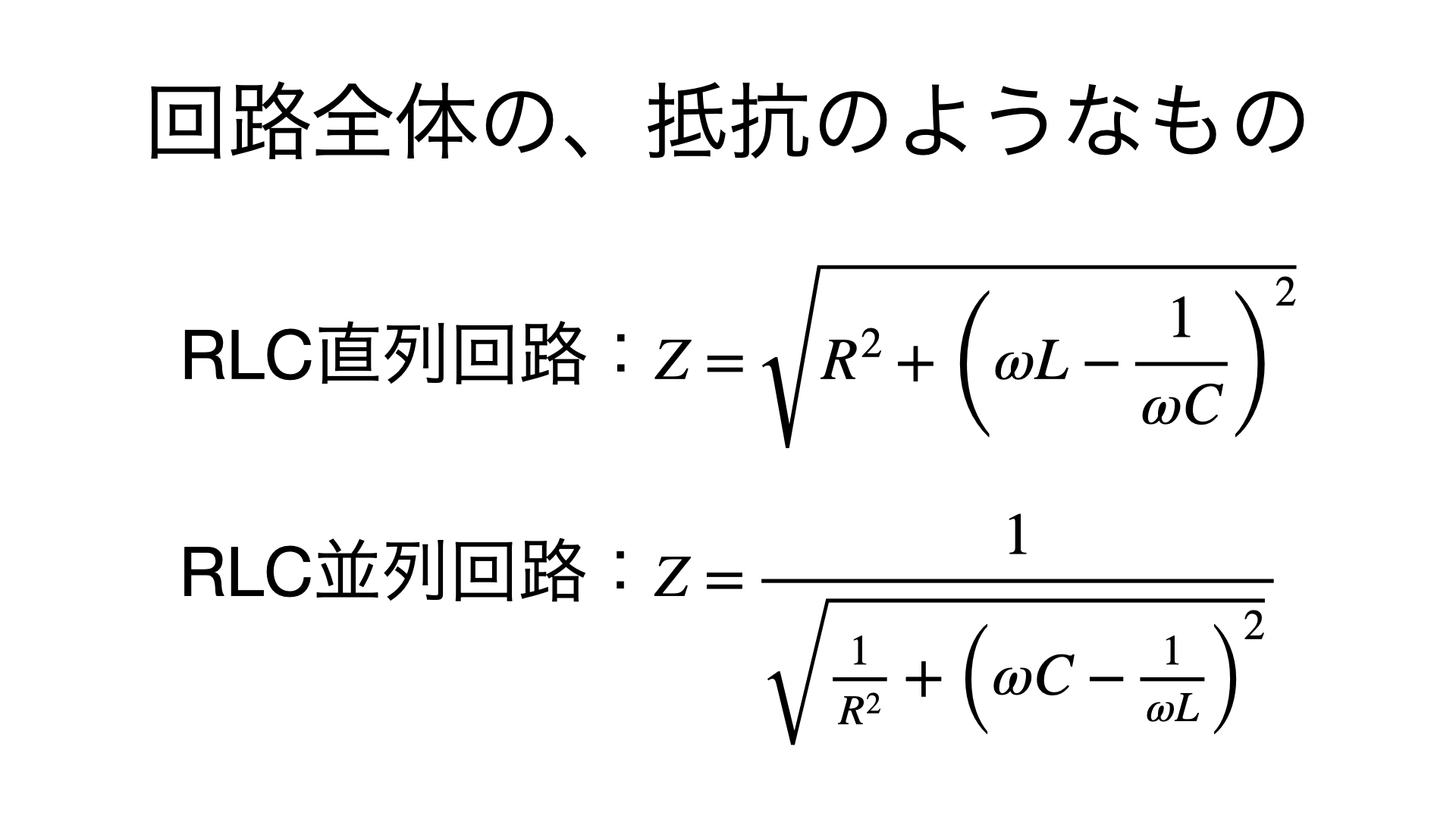 いわば、インピーダンスは合成抵抗のようなイメージ。(位相のずれがあるから、合成抵抗よりはややこしい)