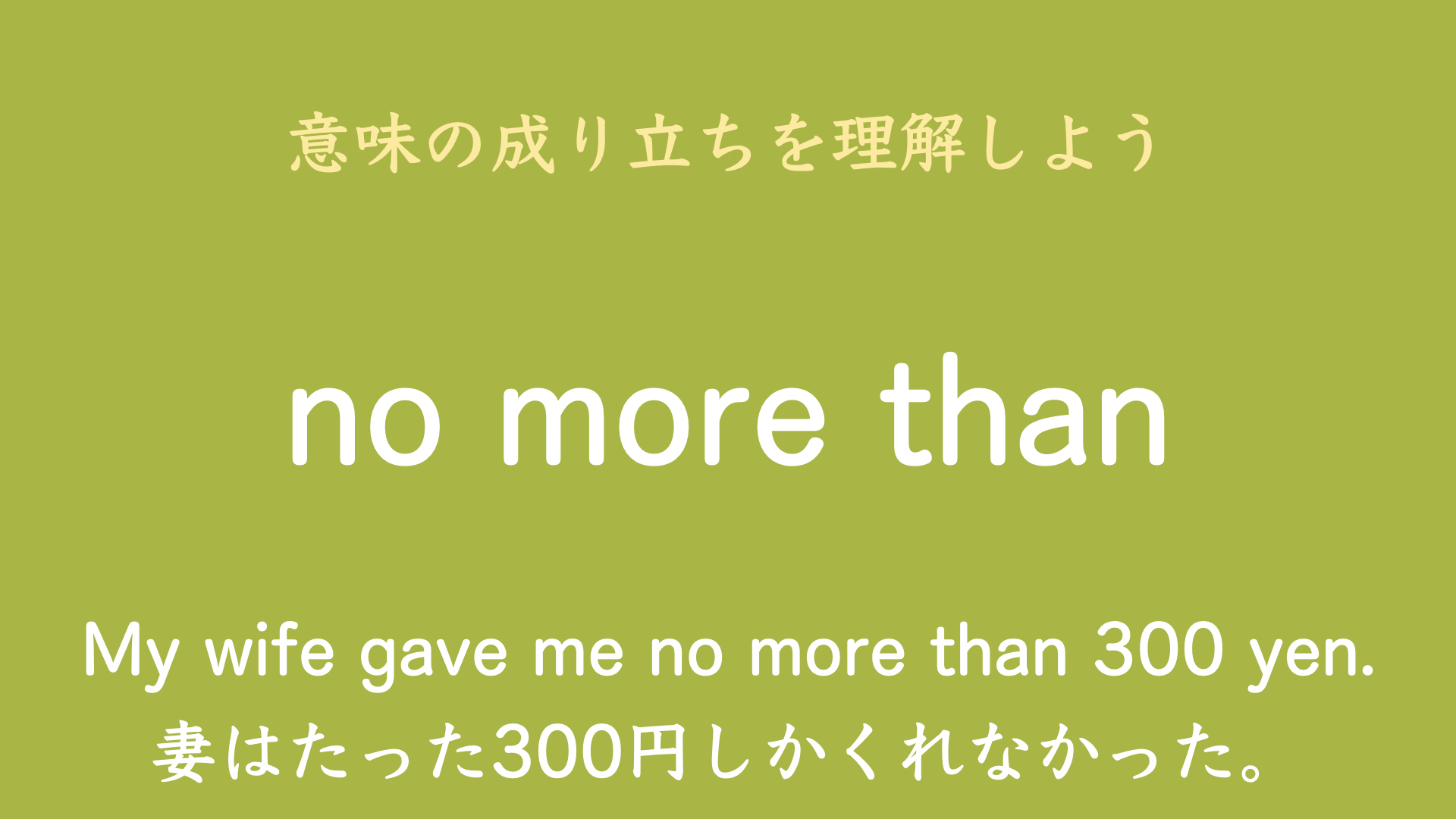 no more than は、no が more の比較の意味を打ち消してイコールの意味になり、さらには more の元々の形 many/much が持つ「多い」というニュアンスも打ち消され、否定的な意味になるのでしたね。