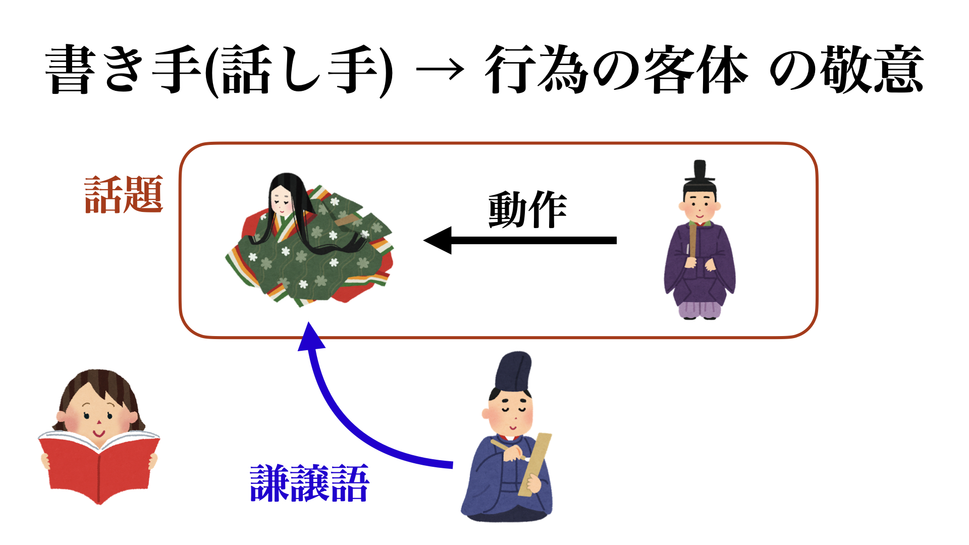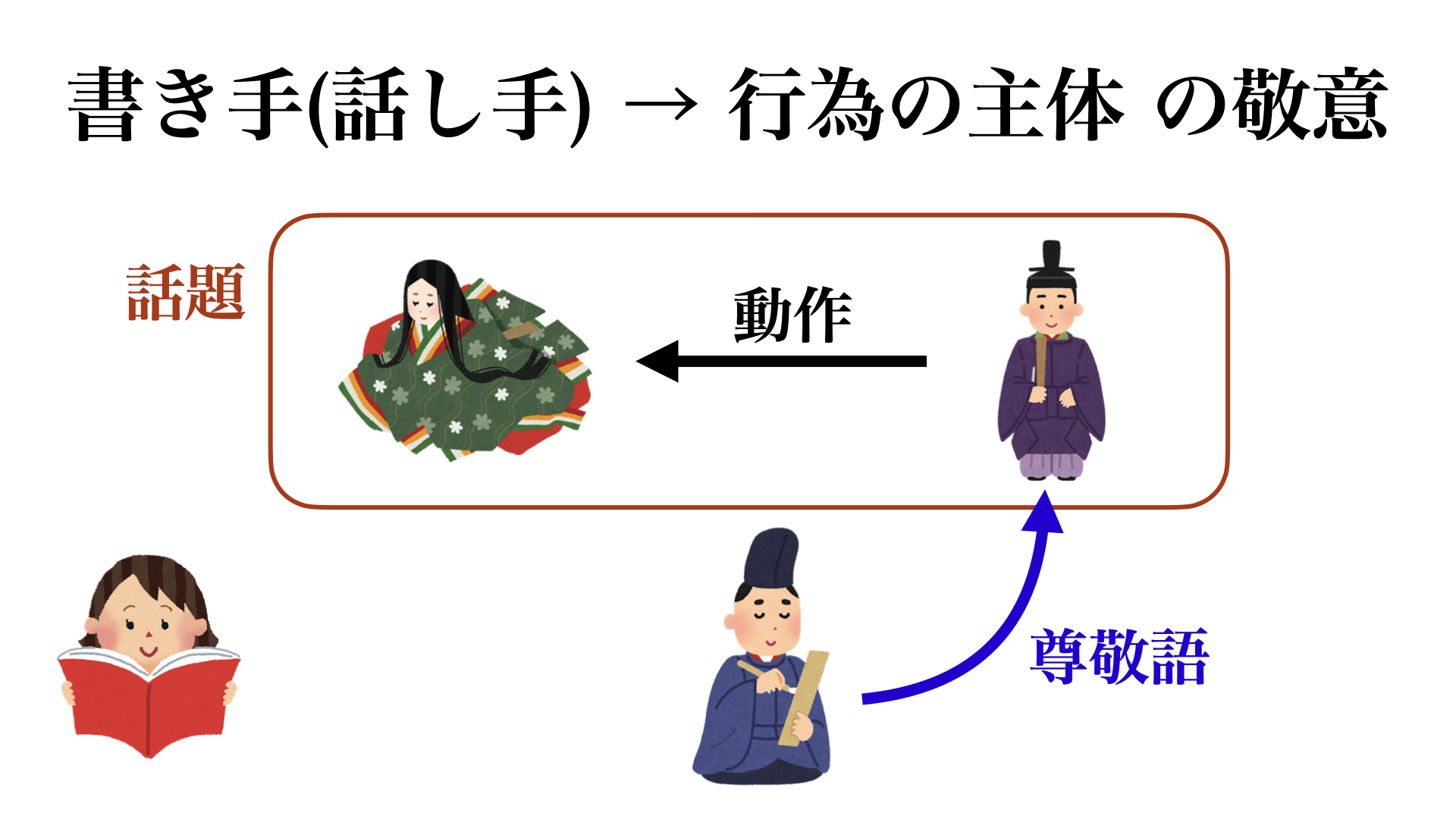古文の敬語は、「誰から誰への敬意なのか」 を把握するのがとても大事なので、下の絵で、尊敬語 や 謙譲語 の違いとともに確認しよう。