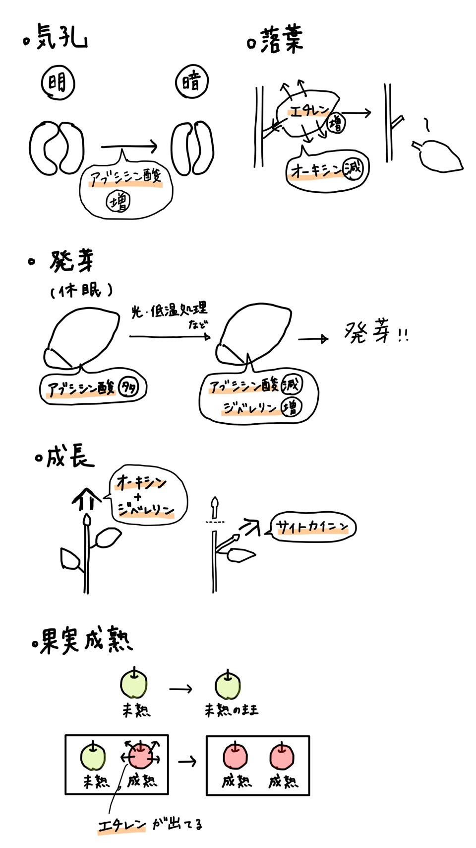 そして、ジベレリンはぐんぐん成長するイメージ、アブシシン酸は寝たり閉じたり、眠そうなイメージ。