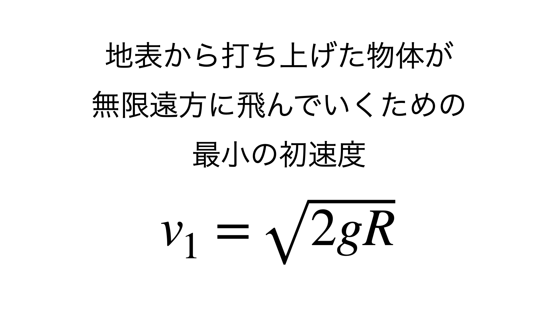 地上から打ち上げた物体が、無限遠に飛んでいくために必要な最小の初速度である 第二宇宙速度 もよく問われるので、違いがわかる人になろう。