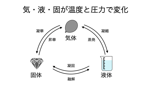 という逆向きの勢いがあります。特に気体分子の運動エネルギーは温度に比例するので、温度が高いほどバラバラになりたがり、温度が低いほどくっつきたがります。温度を上げると水が沸騰したりすることからもイメージが湧きますね。