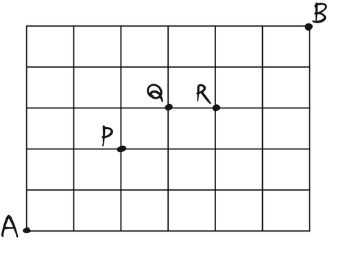 余事象で考える。つまり、全体の道順の数から、 を通ってしまう道順の数を除けば良い。 を通ってしまう道順の数は、 と同様に掛け算で考えることができる。