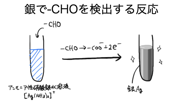 アンモニア性硝酸銀水溶液にアルデヒドを加えて加熱すると、試験管の表面に鏡状の銀が張り付く「銀鏡反応」が起こります。