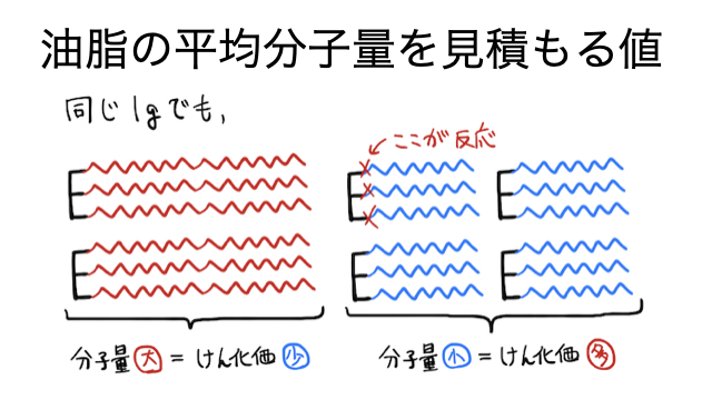 「けん化価」とは、油脂の平均分子量を見積もるための指標のこと。具体的には「1gの油脂をけん化するのに必要な