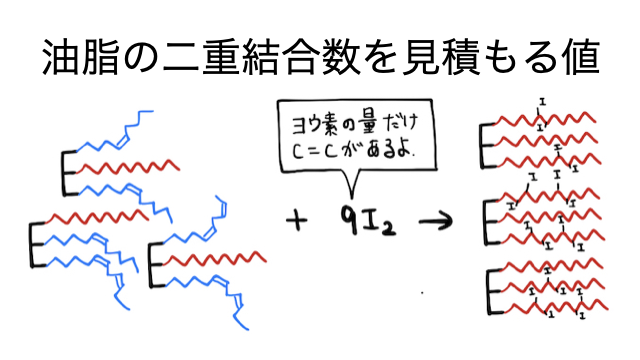 油脂はエステルなので、強塩基を加えることでけん化が起こり分解します。このとき同じ1gの油脂でも、分子量が小さいほど粒の数が多いため、けん化に必要なが増えます。逆に、分子量が大きければ粒の数が少ないため、けん化に必要なが減ります。