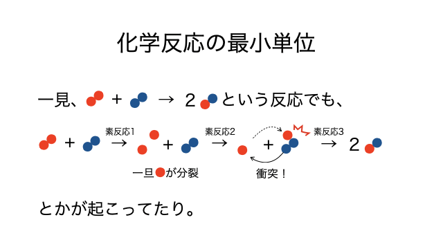 しかし実は必ずしも以上が正しいとは限りません。なぜなら、実際に化学反応をスローモーションで見ると、ただただ衝突して起こるよりも複雑な現象が起こっていることも多いからです(*注2)。詳細は素反応で説明してここでは省略しますが、とにかく、濃度のかけ算っぽく書けることも多いけど実際には実験して確かめてみないとわからないということです。