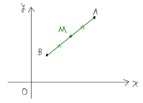 で表される。簡単にいうと、x 座標、y 座標、それぞれ仲良く平均を取ればOK。空間座標の場合は、z 座標も平均をとればOK。