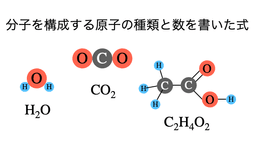 たとえば分子である水は、2粒のと1粒のでできるから分子式でと表します。一方、結晶である塩化ナトリウムは、具体的に何粒のとからできるかはわかりません。しかしの割合であることはわかるので、この比を用いて組成式でと表します。