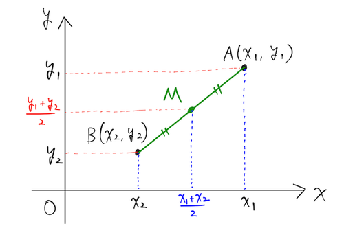 で表される。中点を M とすると、グラフでのイメージはこんな感じで、 x 座標と y 座標のそれぞれで平均を取っていると理解すると、頭に入ってきやすいと思う。